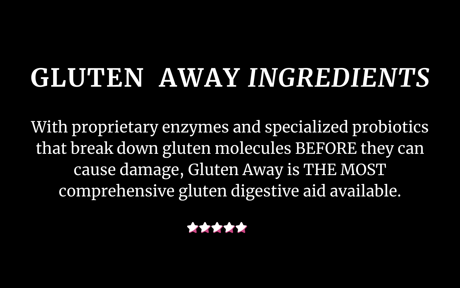 It doesn’t take much for gluten to hurt you: 100 mg (the size of a few bread crumbs) can set you off. But avoiding gluten is no easy task. Research shows that it’s in up to 50% of all restaurant “gluten-free” foods, and hiding in plain sight in medication, gum, toothpaste, and beauty care products. That’s why we developed Gluten Away. With proprietary enzymes and specialized probiotics that break down gluten molecules BEFORE they can cause damage, Gluten Away is THE MOST comprehensive gluten digestive aid available.