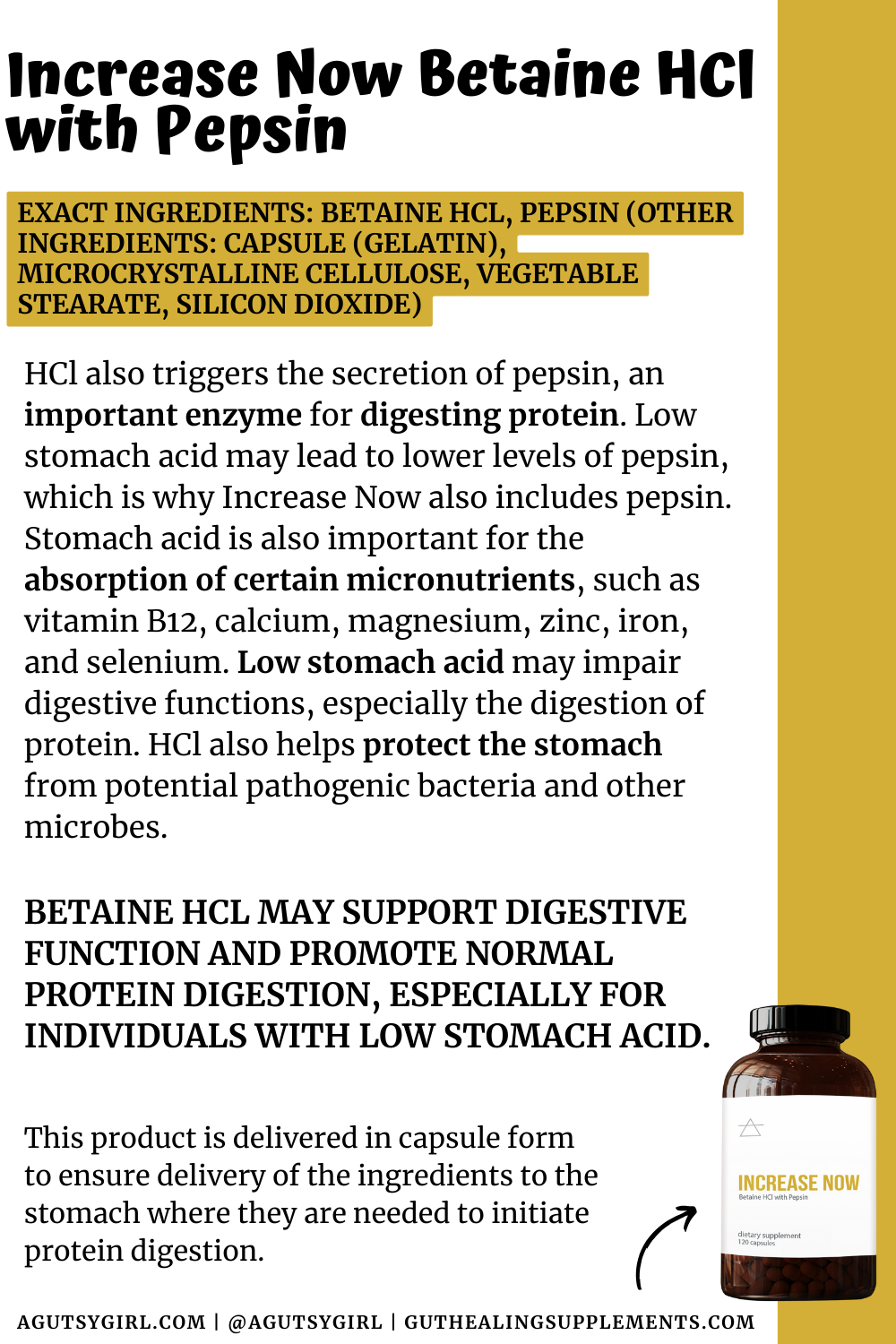 Increase Now - Betaine HCl provides 750 mg of betaine hydrochloride per capsule along with pepsin, a key protein digestive enzyme produced in the stomach