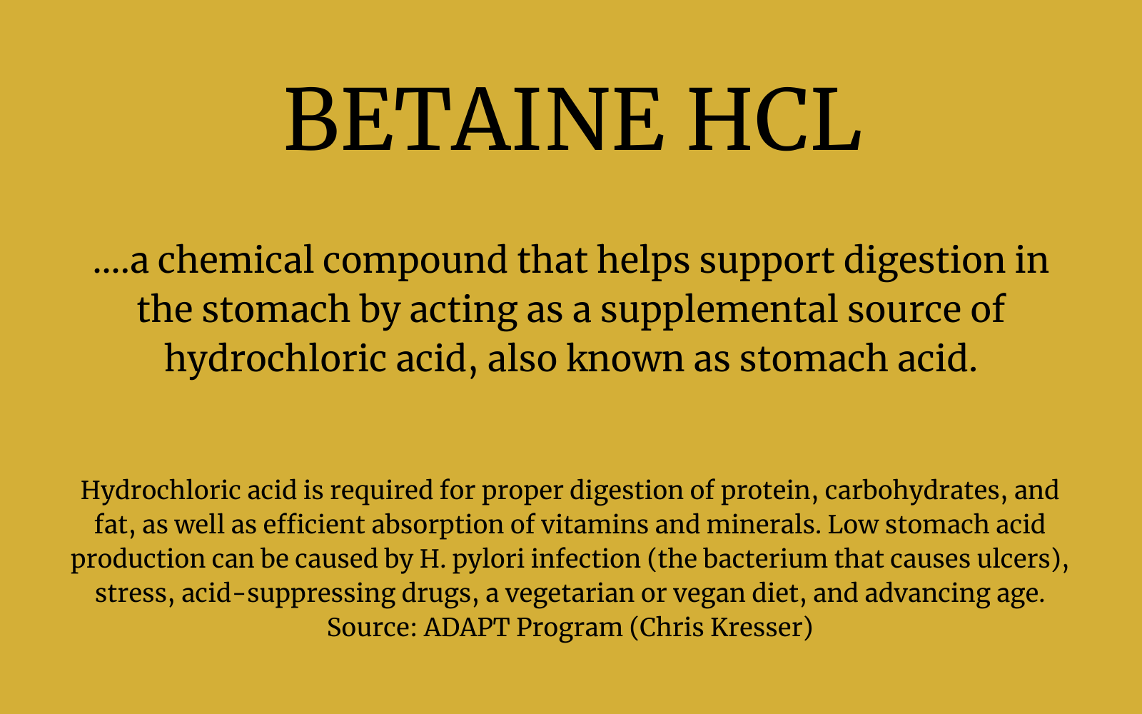 Low stomach acid? Betaine Hcl can help increase it + reduce bloating.