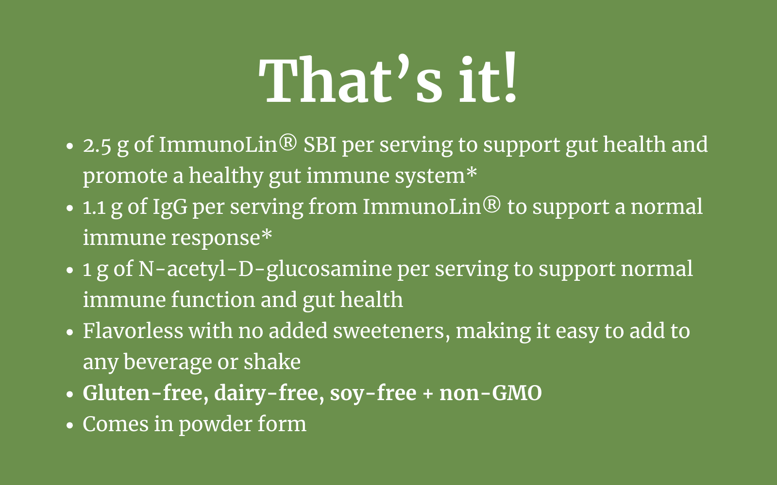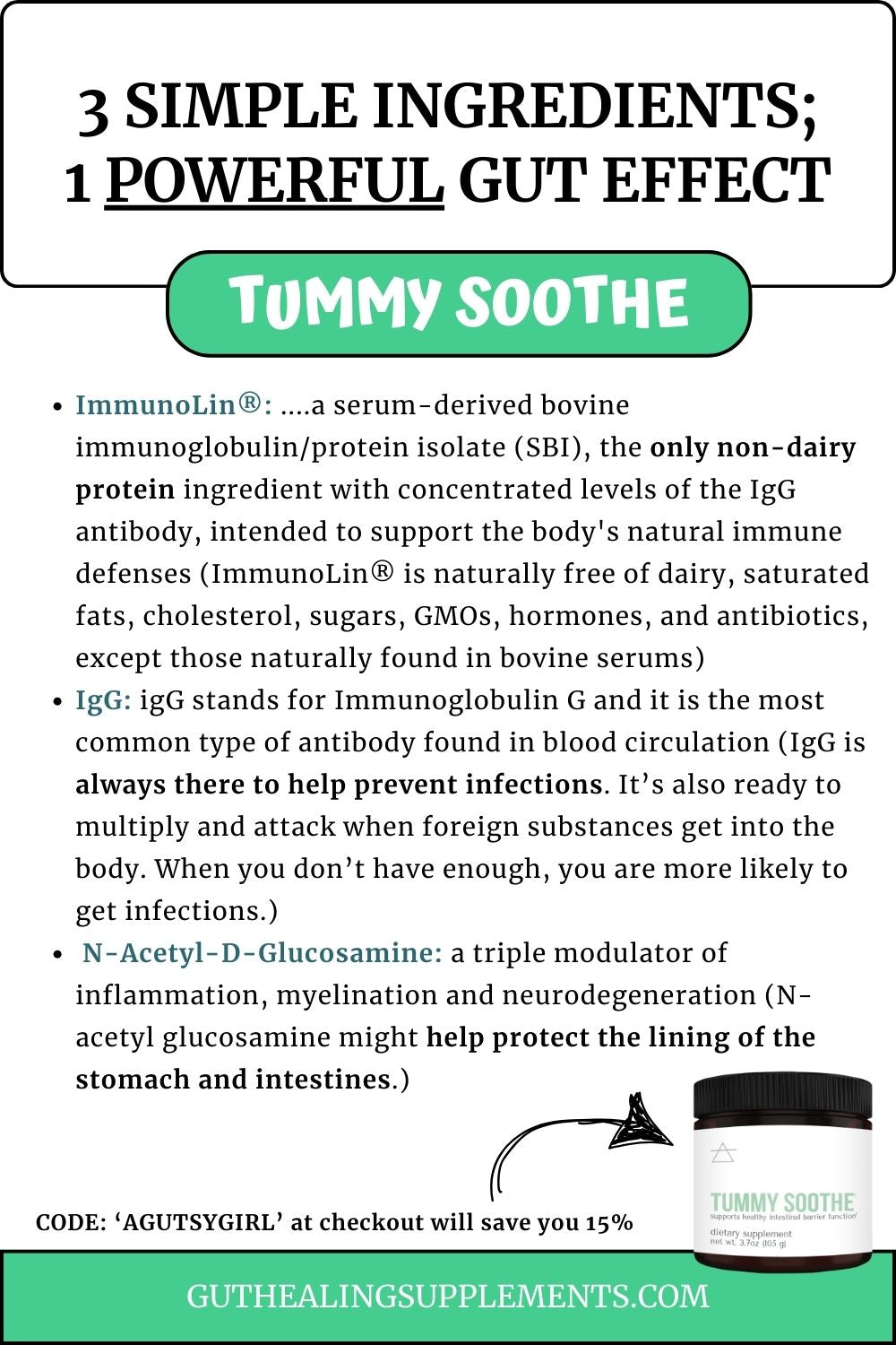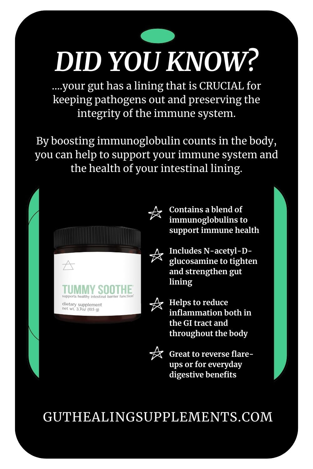 Tummy Soothe is a comprehensive blend ofimmunoglobulins and N-acetyl-D-glucosamine, specifically formulated to help repair and support the health of the gut lining. This is a must have tool in your digestive health kit and can be used both to reverse flare-ups and to support every day digestive health.