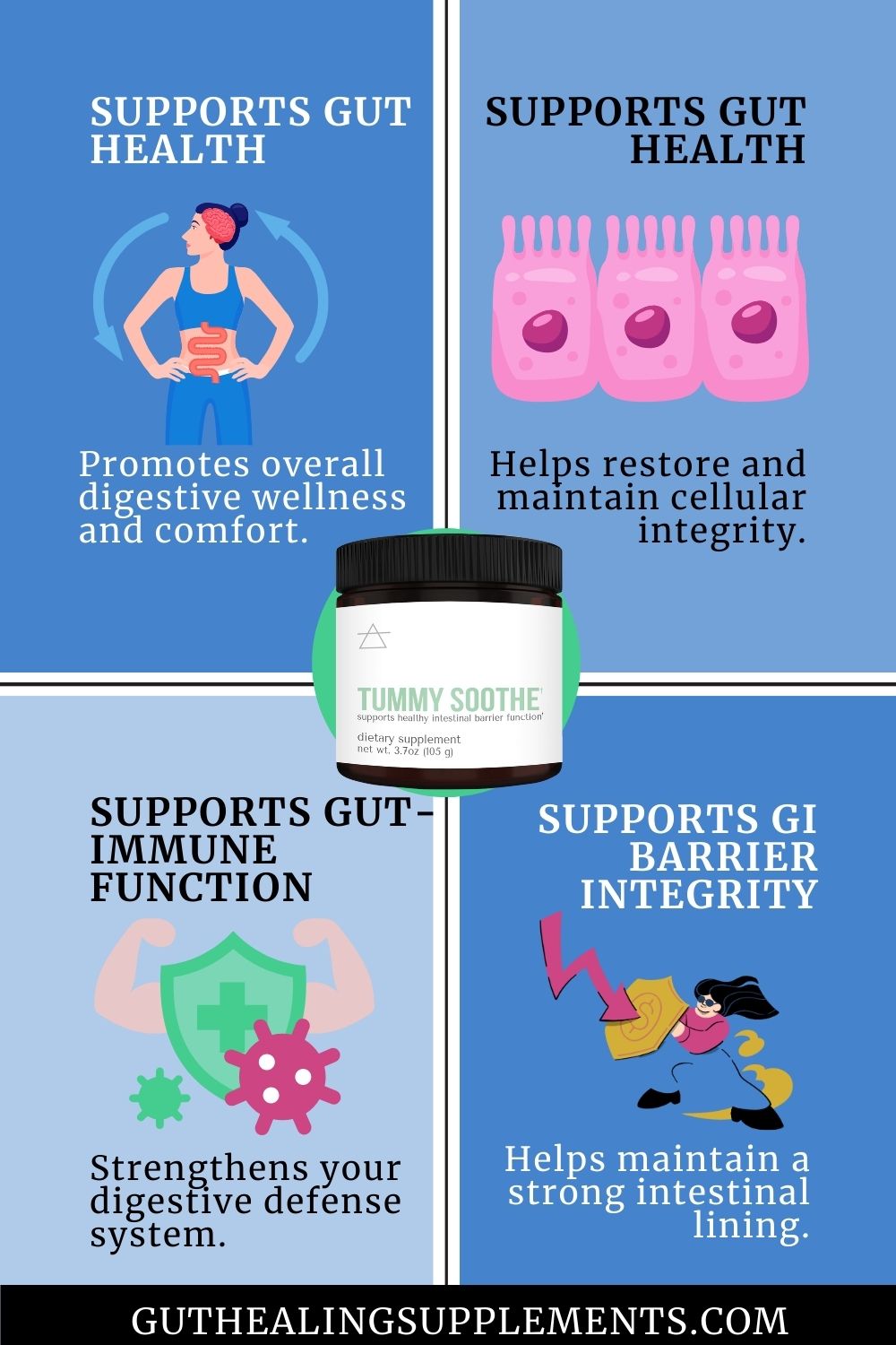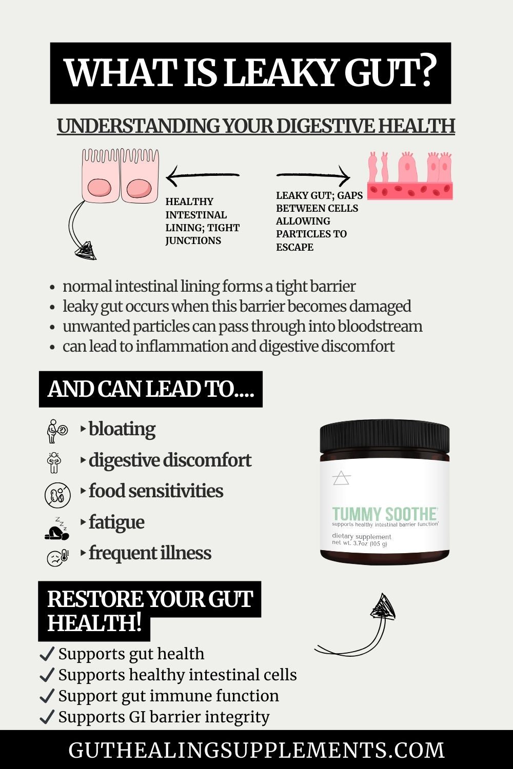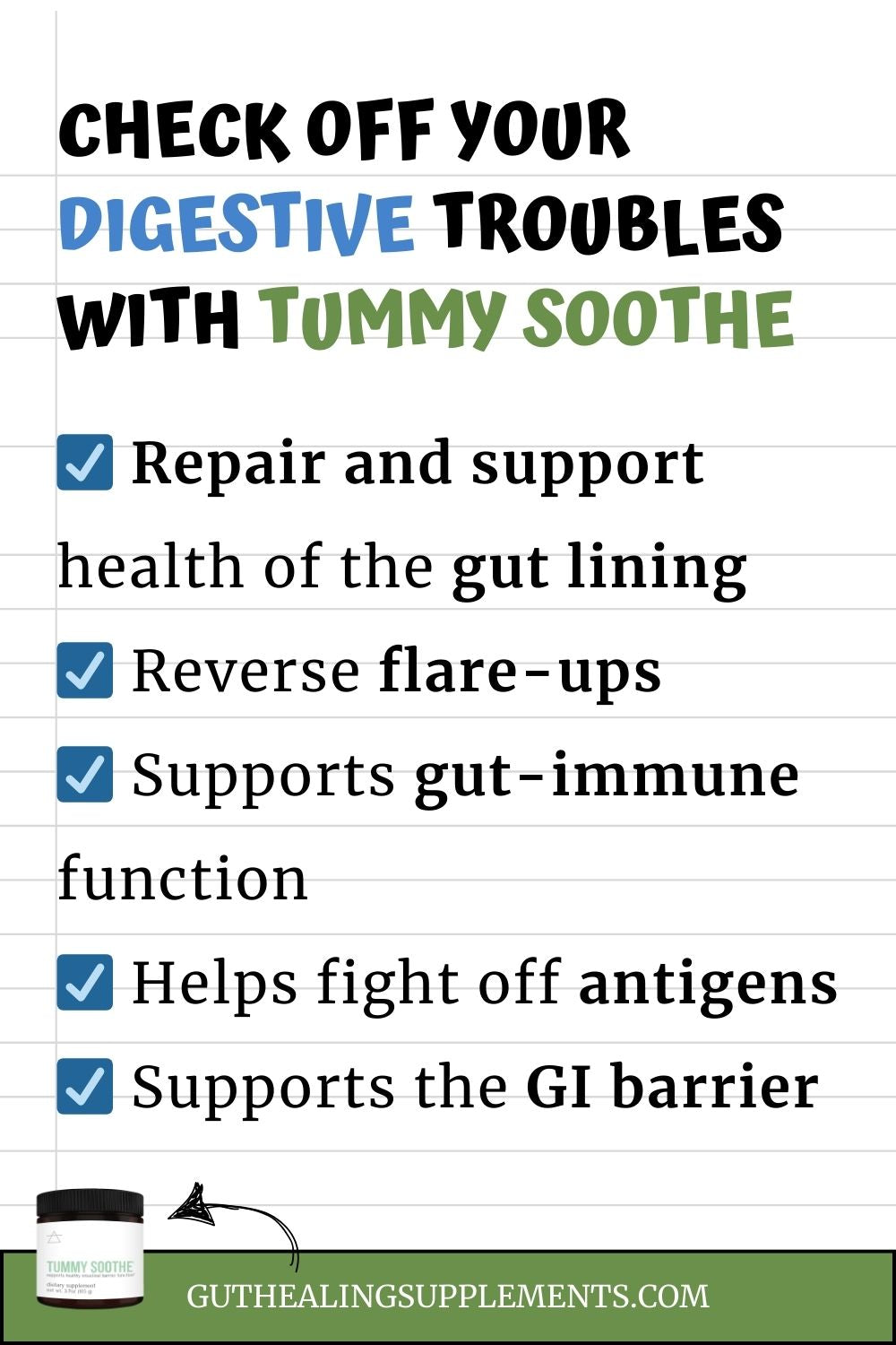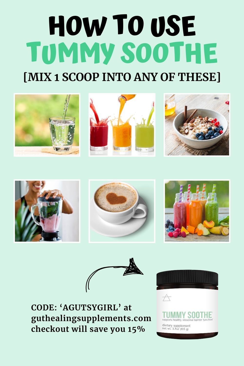 A high quality intestinal support supplement, like Tummy Soothe, can help repair the lining of your gut to prevent harmful “leaky-gut” and more!